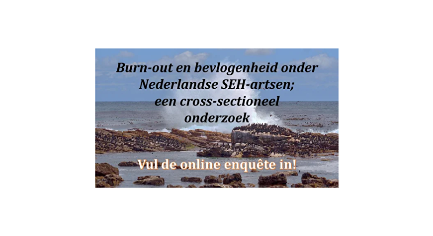 Half mei ontvangen alle SEH-artsen KNMG de uitnodiging voor het landelijke onderzoek naar burn-out en bevlogenheid. Deze wetenschappelijke studie sluit goed aan op de ontwikkelingen binnen ons vakgebied. Het onderzoeksproject kreeg december de stimuleringssubsidie van het SGOfonds. Het bestuur onderschrijft het belang van de studie en vraagt alle SEH-artsen om deel te nemen aan het onderzoek.